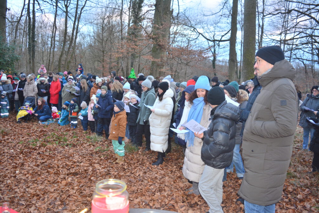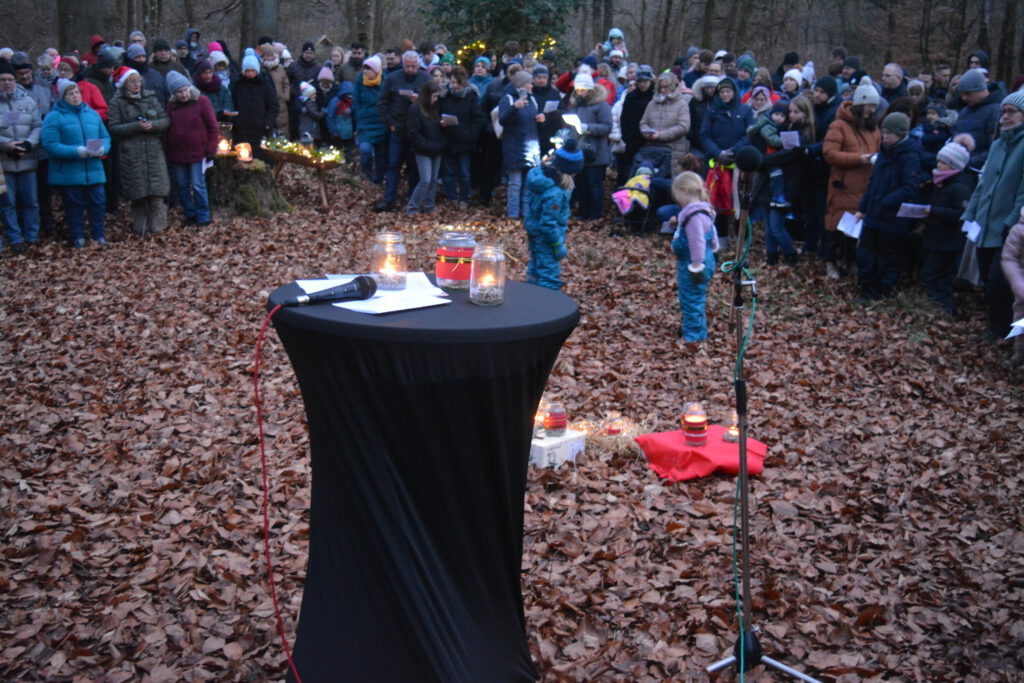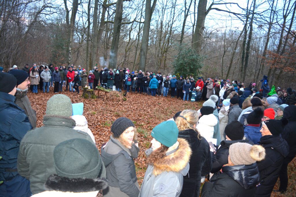 Bald schon kommen die Menschen gemeinsam vom Parkplatz des Friedhof aus kommend auf dem ausgeleuchteten Weg zur Lichtung.